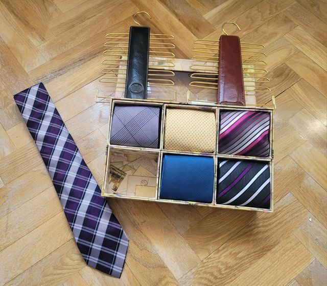 Juego de 6 corbatas a estrenar.Incluye caja organizadora para guardarlas y dos corbateros para armario