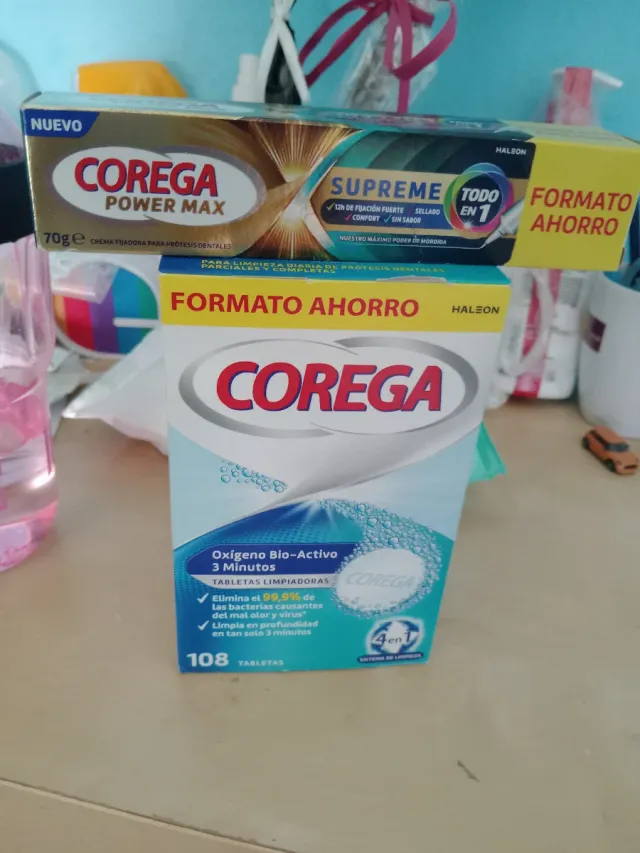 Detalles del productoPack de productos Corega para el cuidado de prótesis dentales.