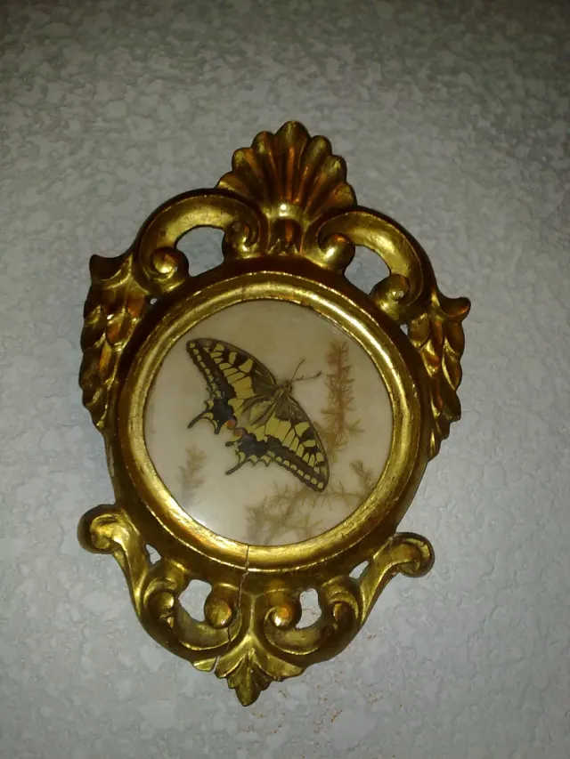 Pequeña cornucopia decorativa con un diseño clásico. - Marco dorado. - Mariposa real - Estilo del siglo XIX.