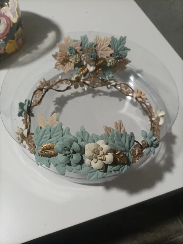 Corona comunión flores beige y verde