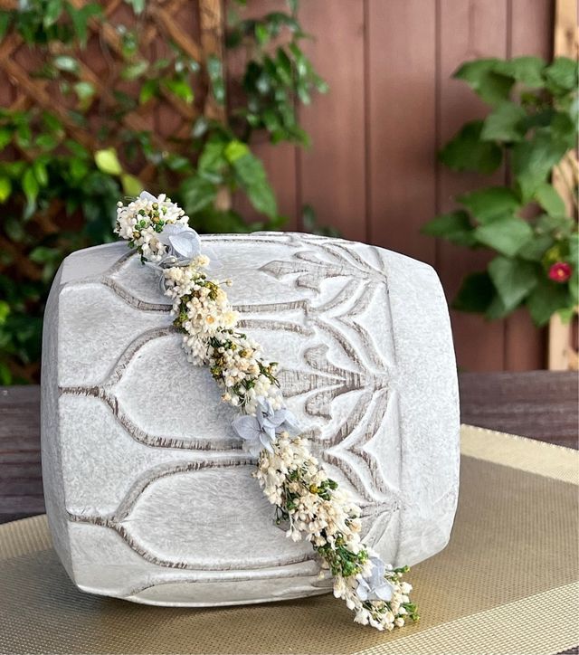 corona comunión, peineta, diadema, corona niña arras, corona azul celeste, verde agua, corona de flores preservadas blanca y azul, coronita fina comunión, corona fina pelo, corona pelo de paniculata y hortensia preservada, corona de paniculata preservada, corona comunión color azul grisaceo, corona azul empolvado, corona gris azulado, corona comunion verde agua