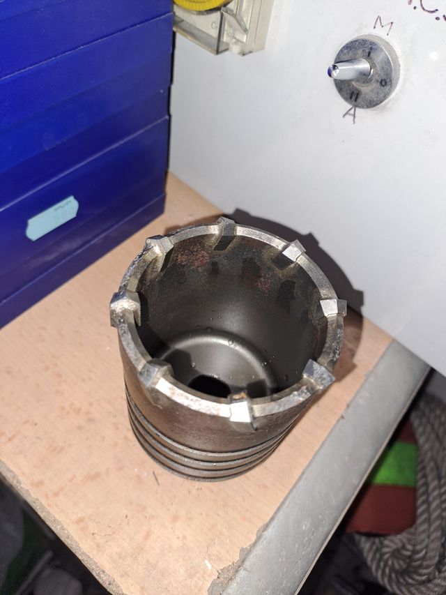 Corona perforadora de metal. 8 dientes de 66mm marca geullet - Diseño cilíndrico con dientes afilados. - Superficie con marcas de uso.