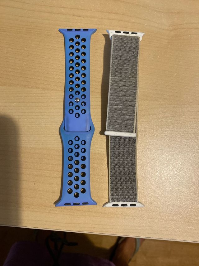 Detalles del productoDos correas para Apple Watch, una de estilo deportivo Nike en color azul y otra de tejido en color gris.