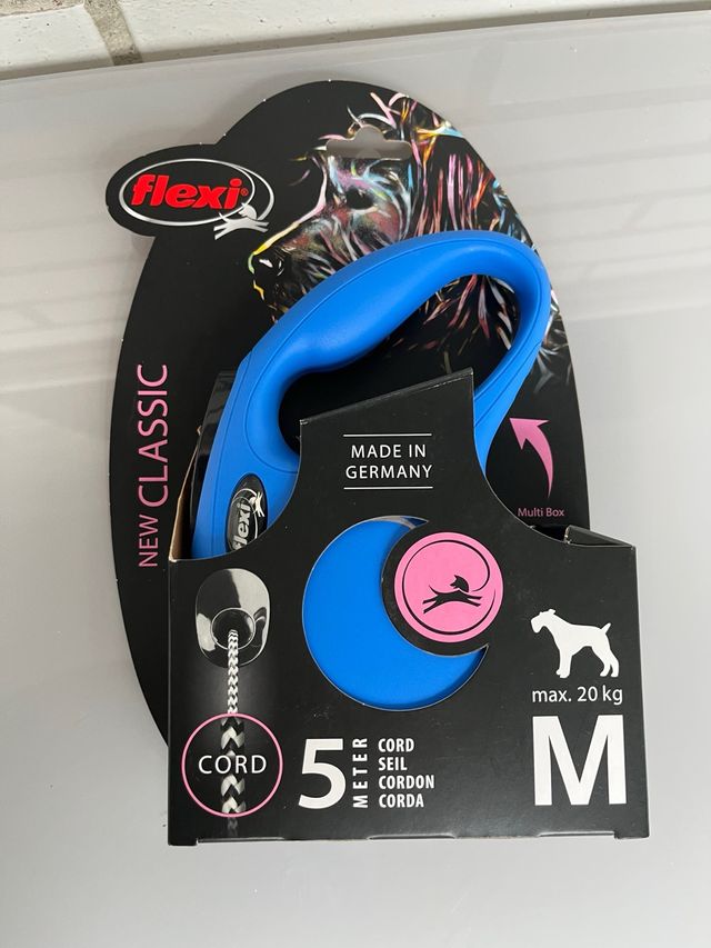 Correa retráctil Flexi Classic para perros de hasta 20 kg. Fabricada en Alemania. - Modelo: Classic - Tamaño: M - Longitud: 5 metros - Tipo: Cordón - Color: Azul