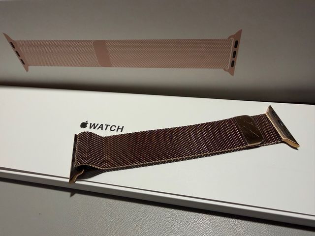 Correa original tipo Milanese Loop para Apple Watch de acero dorado, 40mm. incluye caja está algo desgastada, de ahí su precio.