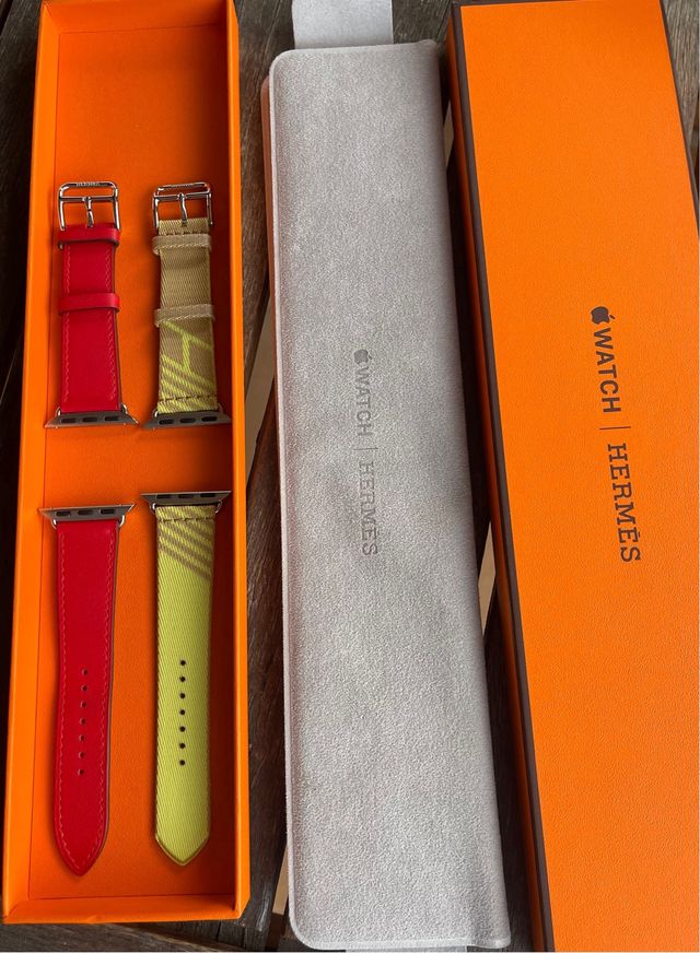 Correas de piel para iwatch de Hermés. sin estrenar. color rojo vivo y amarilla limon con logo Hermes. con estuche y funda de piel con garantia.