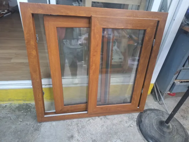 Ventana corredera de PVC con acabado en roble. Sus medidas son 1065x980 mm. - Material: PVC. - Acabado: Roble. - Tipo: Corredera.