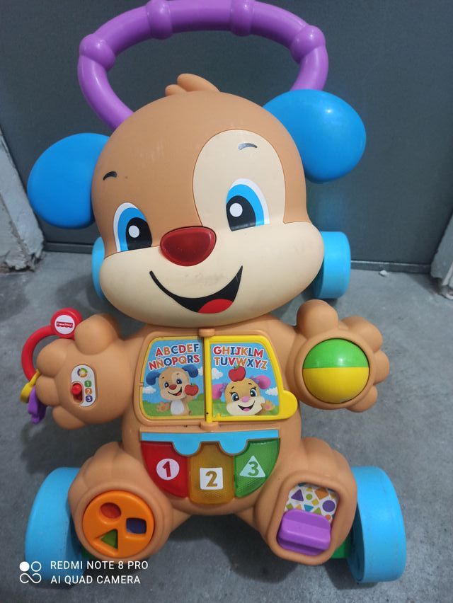 Correpasillos interactivo con forma de perro. - Mango morado para sujetar. - Ruedas azules. - Cara sonriente con ojos azules y nariz roja.