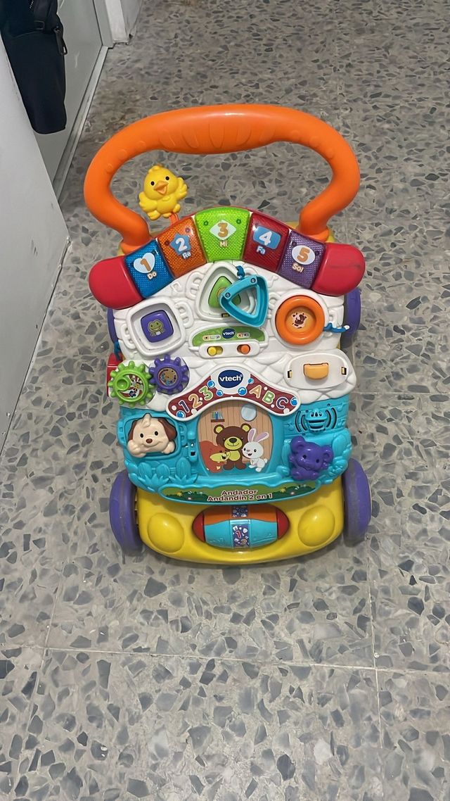Correpasillos Vtech con actividades interactivas para el aprendizaje. - Mango naranja. - Panel de juegos con números, letras y animales. - Ruedas de colores.