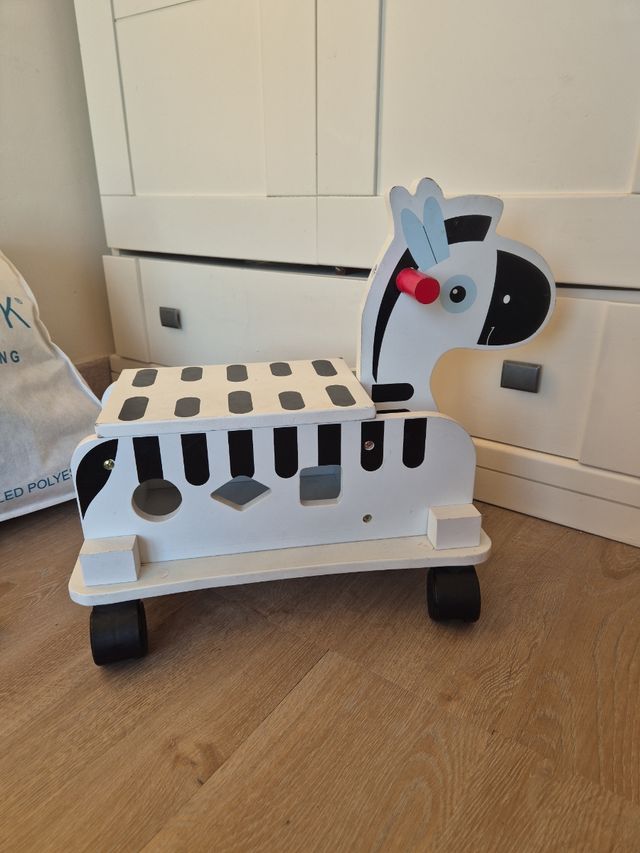 Correpasillos de madera con diseño de cebra, ideal para el desarrollo Montessori. - Fabricado en madera. - Diseño de cebra. - Figuras para encajar.