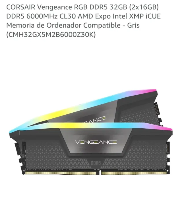 Detalles del productoMemoria RAM Corsair Vengeance RGB DDR5 de 32GB (2 módulos de 16GB) con una velocidad de 6000MHz y latencia CL30. Compatible con AMD Expo e Intel XMP.