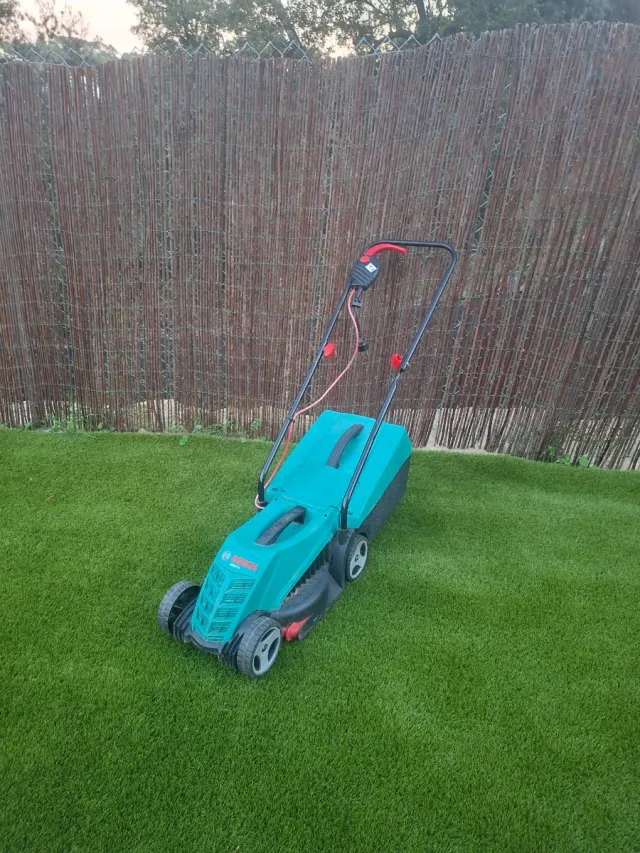 Cortacésped eléctrico Bosch de color verde y negro. Ideal para mantener tu jardín. - Diseño moderno. - Ruedas para facilitar el movimiento.