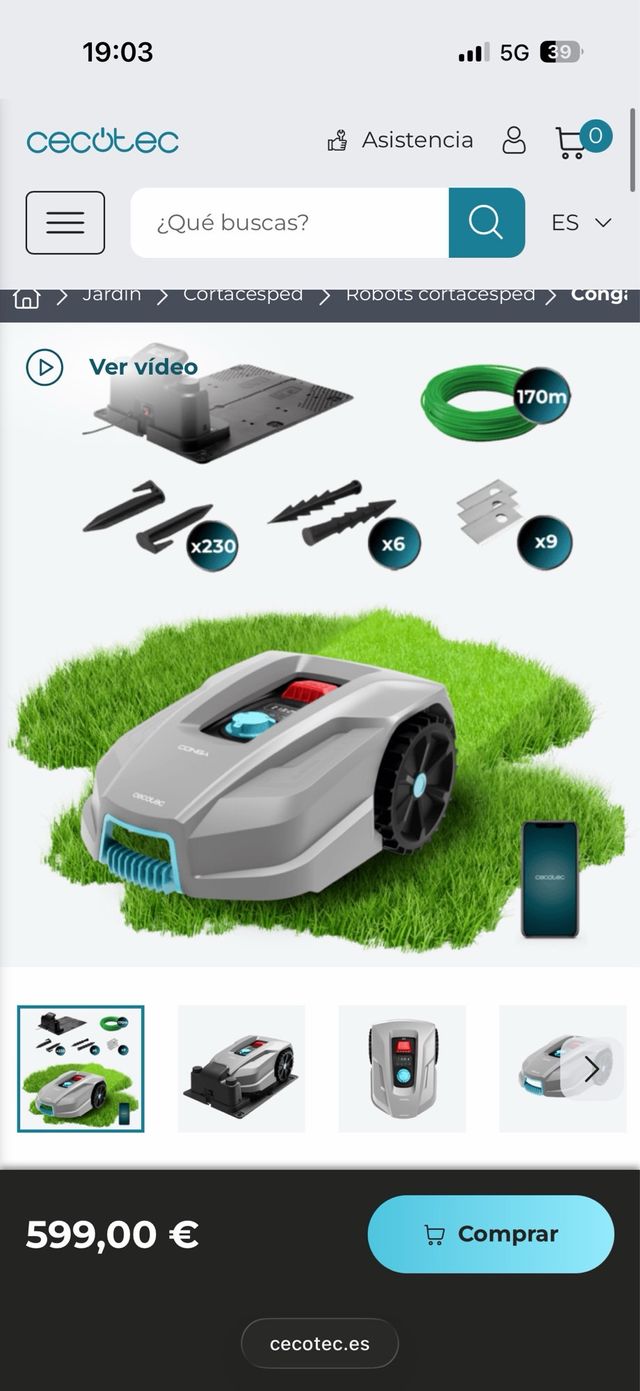 Detalles del productoRobot cortacésped Cecotec en color gris y azul. Incluye base de carga, cable perimetral de 170m, estacas (x230), tornillos (x6) y cuchillas (x9).