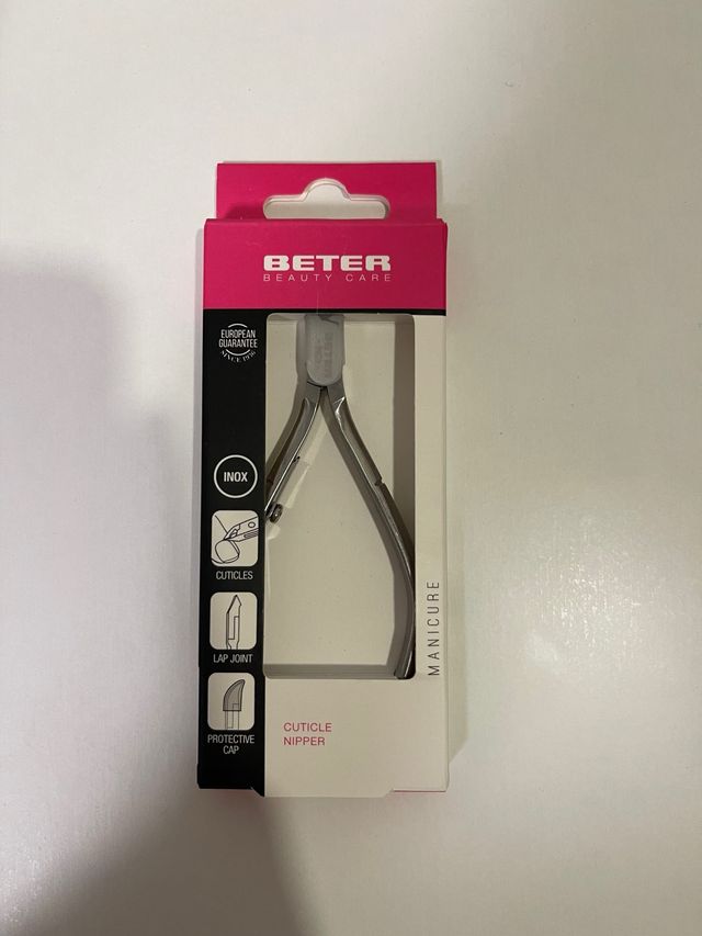 Cortacutículas de acero inoxidable Beter. - Material: INOX. - Cierre de solapa. - Incluye capuchón protector.