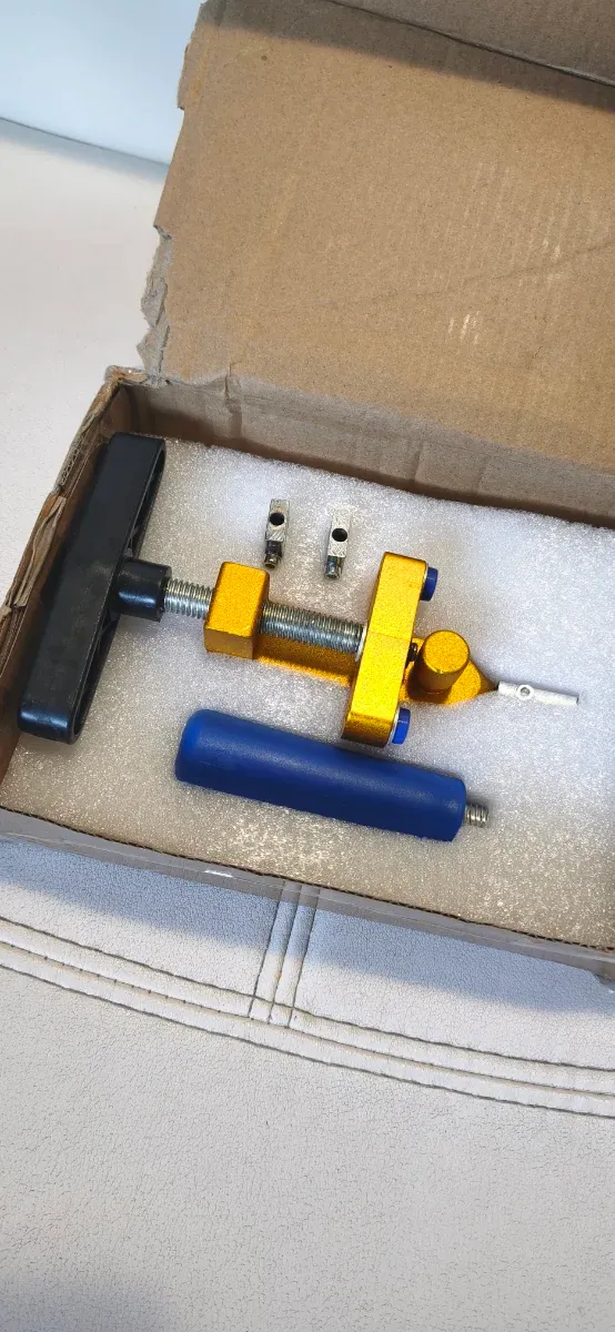 Detalles del productoHerramienta para cortar azulejos con precisión. Fabricada en aluminio dorado y con mango ergonómico azul.