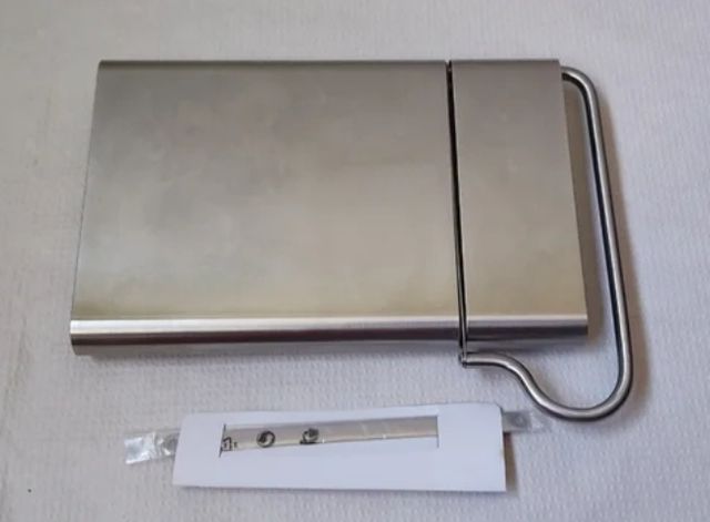 Tabla de cortar queso, de acero inoxidable. Con cuchilla de repuesto. Se vende por falta de uso.