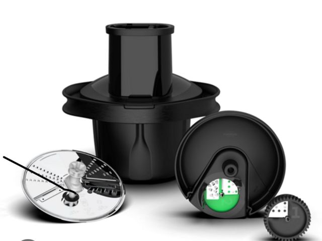 Accesorio cortador para Thermomix TM7. - Incluye disco cortador. - Tapa de seguridad. - Engranaje. - Recipiente.
