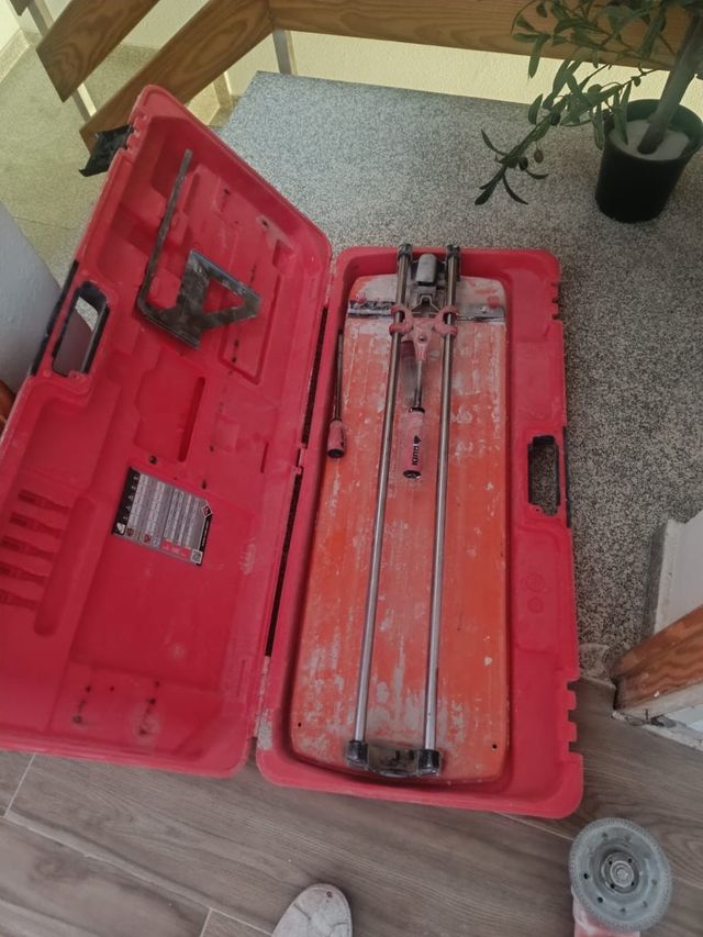 Cortadora de azulejos 70 cm profesional en su maletín. - Maletín rojo de transporte. - Guías metálicas para corte recto. - Base naranja para apoyo de azulejos.