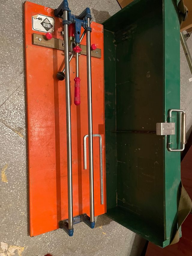 Cortadora de azulejos profesional Rubi de 60cm, ideal para cortes precisos. - Base naranja. - Guías de corte metálicas. - Incluye maletín verde para transporte.