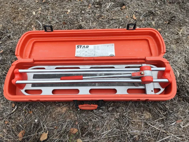 Cortadora de baldosas STAR en su maletín original. - Maletín de plástico naranja. - Guías de corte metálicas. - Mango de agarre rojo.