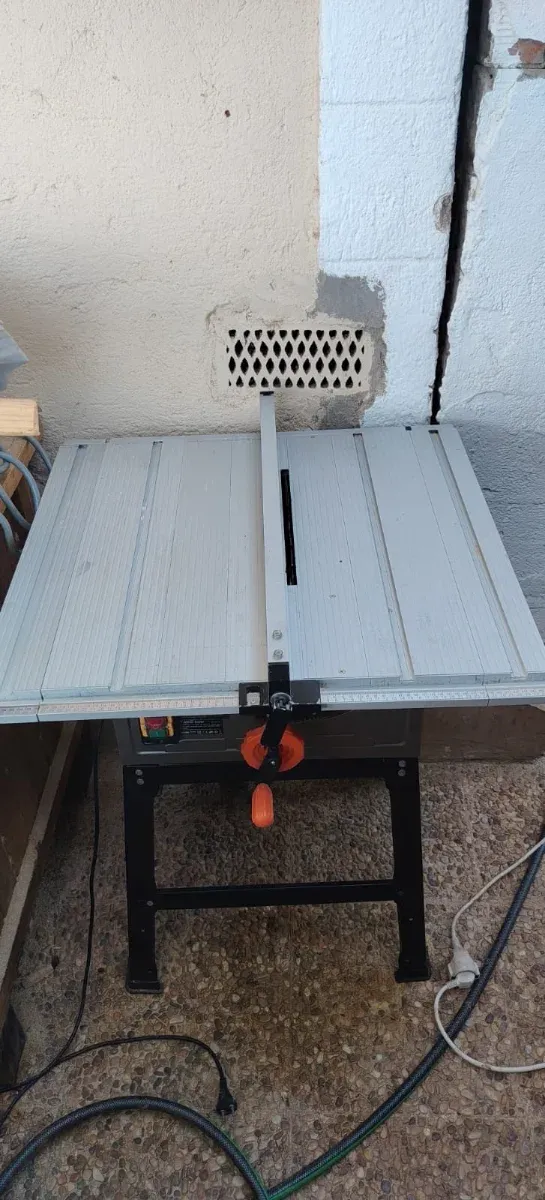 Cortadora de madera para trabajos de carpintería. - Mesa de corte de color gris. - Guía de corte ajustable. - Base metálica negra.
