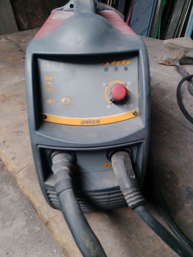 Equipo de corte por plasma Selco. - Panel de control con dial y luces indicadoras. - Conexiones frontales para mangueras. - Diseño robusto y compacto.