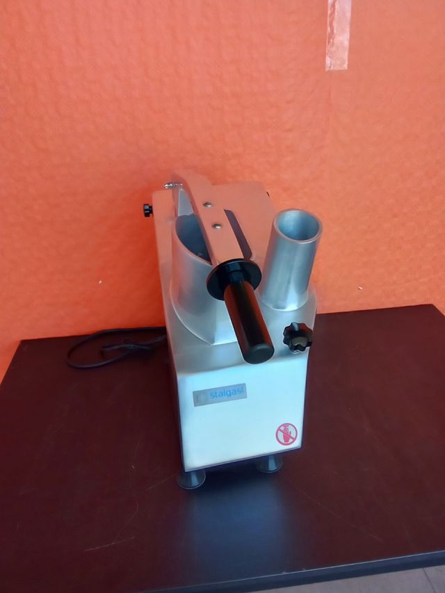Cortadora de vegetales con 5 discos de corte hechos en acero y con estructura en aluminio anodizado. Los discos trituran y hacen rodajas a diferentes medidas. La entrada de los alimentos es de 160x75 mm y diámetro de 50 mm. Patas de goma.