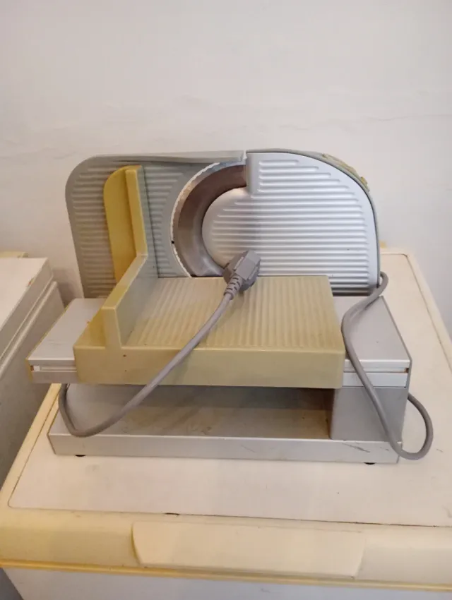 Máquina cortafiambres eléctrica con acabado plateado y detalles en color crema. - Diseño compacto. - Bandeja de corte. - Protector de cuchilla.