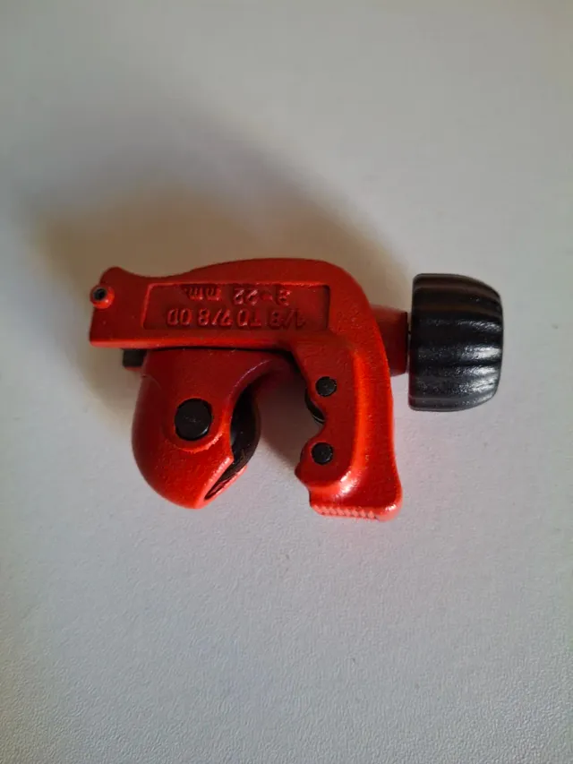 Cortatubos de la marca SUPEREGO, ideal para trabajos de fontanería. - Cuerpo de metal rojo. - Rueda de corte. - Mango negro para ajuste.