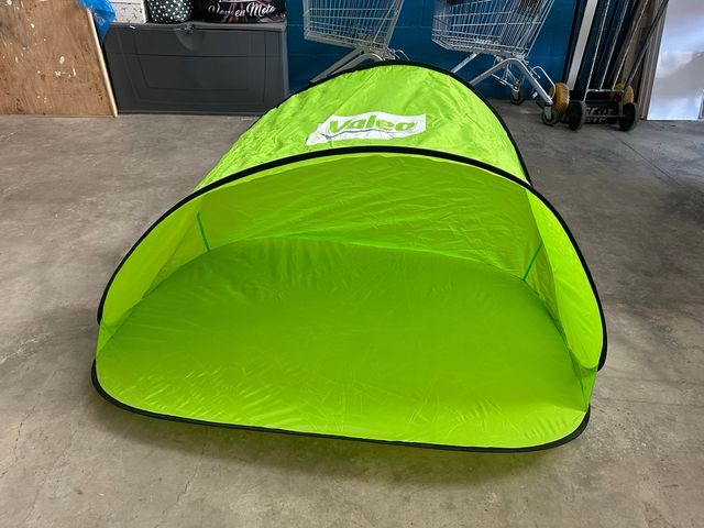 Detalles del productoCortavientos pop-up de color verde brillante, ideal para protegerse del sol y el viento.