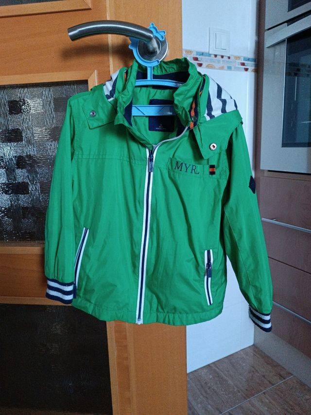 chaqueta cortavientos, color verde con gorro que se puede quitar con automáticos. marca Mayoría. con cremallera en los bolsillos. talla 3 años