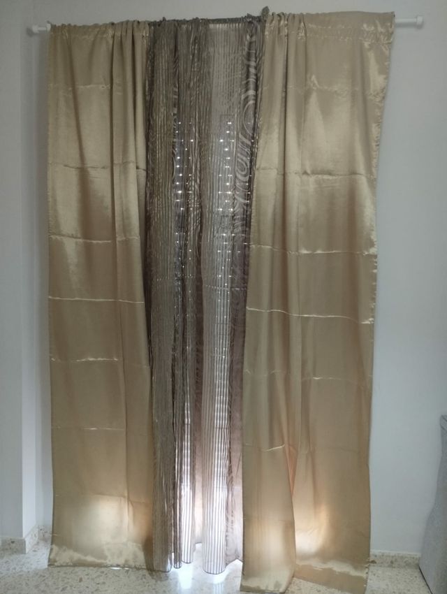 cortinas en muy buen estado consta de dos visillos y dos patas. las líneas que se ven en las patas son arrugas de estar dobladas. son totalmente lisas