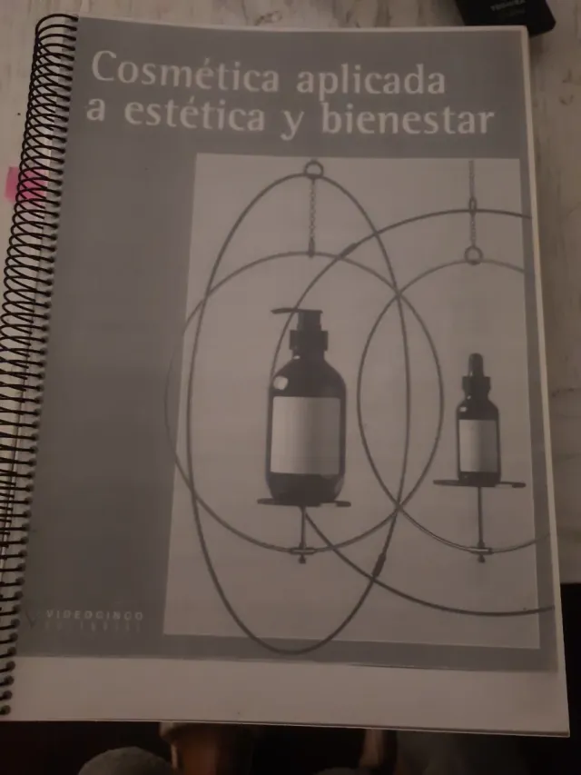 Libro sobre cosmética aplicada a estética y bienestar. - Cubierta con espiral. - Ilustraciones de frascos de cosméticos.