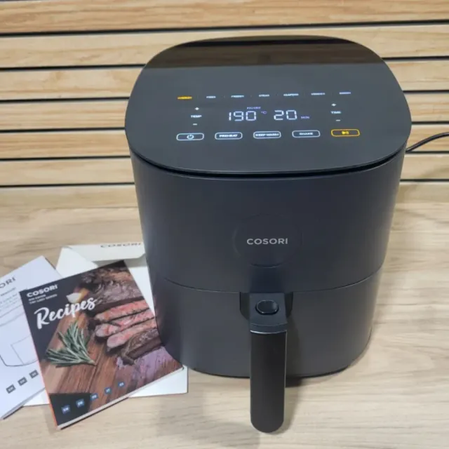 Detalles del productoFreidora de aire Cosori L501 en color negro. Incluye manual de instrucciones y recetario.