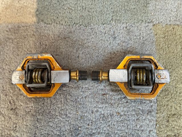 Pedales Crank Brothers Candy 11 para bicicleta de montaña. - Diseño en color Gold - Mecanismo de muelle visible. - Material Titanio