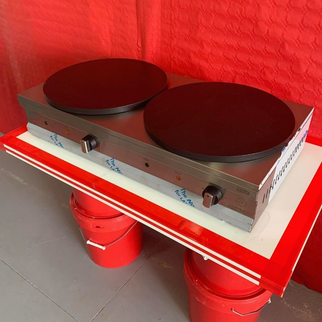 Acero inox + molde de hierro fundido. Temperatura regulable de 50 - 300º. Gas butano (modificable a gas natural). Peso: 25 Kg. Potencia: 8 Kw. Accesorios: Esparcidor de madera