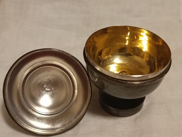 Detalles del productoPequeña crismera o copón de plata 950 de viaje francesa muy antigua. Con su pátina original, la parte inferior de su interior conserva su baño de oro original. Diseño sencillo y humilde. Unos 47 gramos.