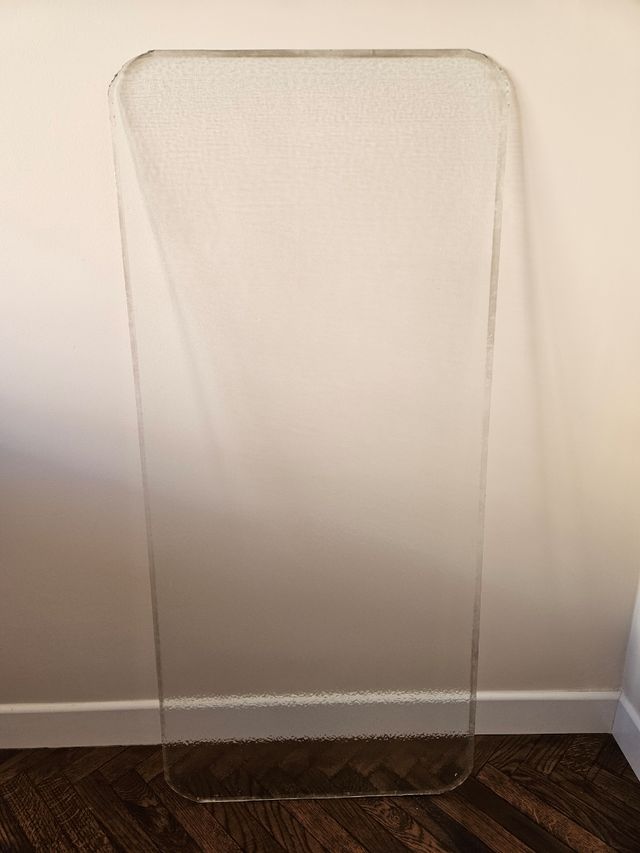 Detalles del productoPanel de cristal con un acabado translúcido, rugoso y bordes suavemente redondeados.
