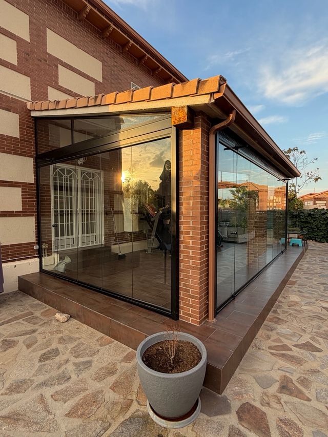 Cristalera abatible de vidrio con estructura negra. - Ideal para porches o terrazas. - Paneles de vidrio que se pliegan completamente. - Marco de aluminio negro.