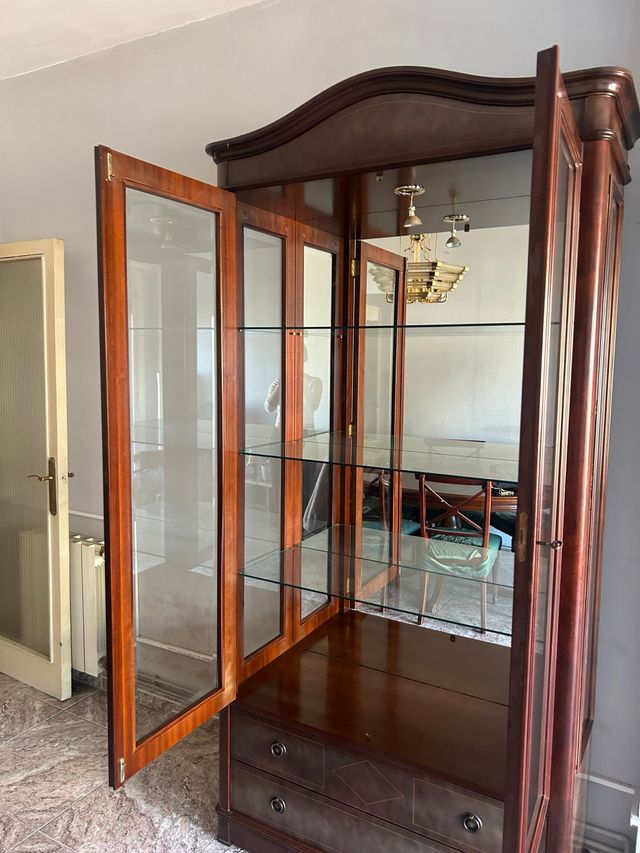 Detalles del productoElegante cristalera de madera oscura con puertas de cristal y estantes interiores.