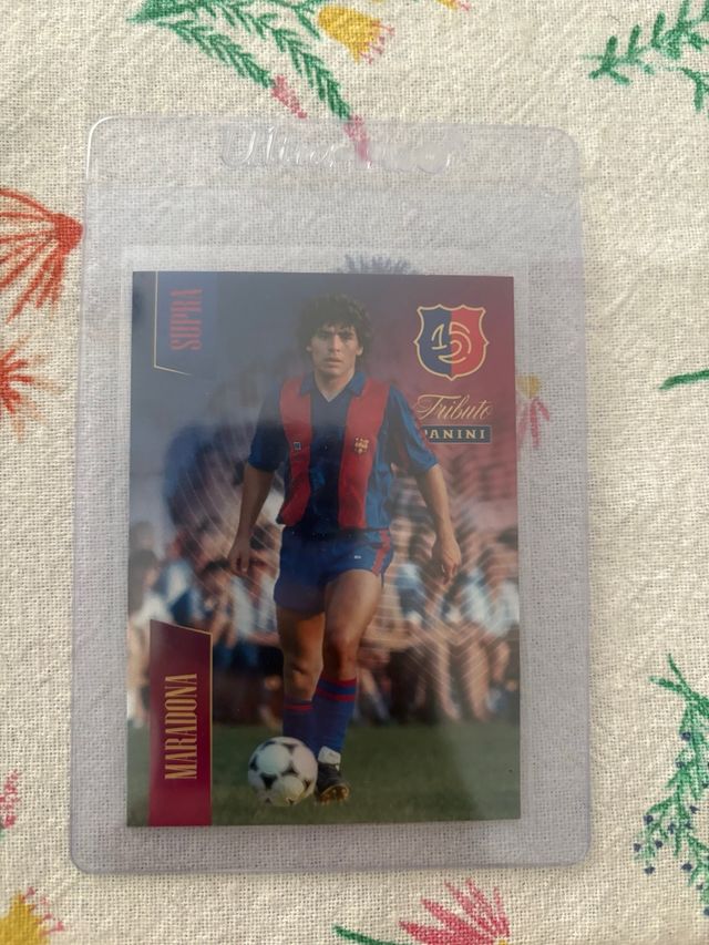 Detalles del productoSe vende una tarjeta coleccionable de Diego Armando Maradona. Es de la colección Panini Tributo, del año 1995 aproximadamente. La tarjeta está en perfecto estado y se encuentra en una funda protectora de plástico rígido. - Incluye una tarjeta. - Edición Panini Tributo. - Muestra a Maradona con el uniforme del FC Barcelona. - La tarjeta está en muy buen estado.