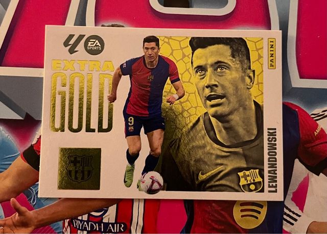 Coleccionable de fútbol EA Sports Extra Gold. - Cromo de Robert Lewandowski. - Diseño con detalles dorados. - Incluye escudo del FC Barcelona.