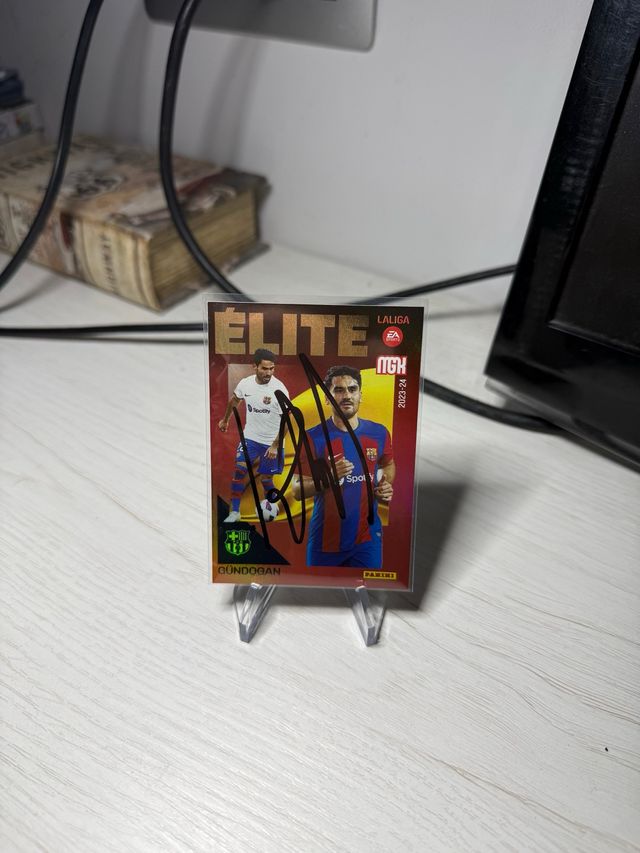 Cromo Élite de LaLiga 2023-24 firmado por Ilkay Gündoğan. - Firma original del jugador. - Diseño Élite de Panini. - Incluye soporte expositor.