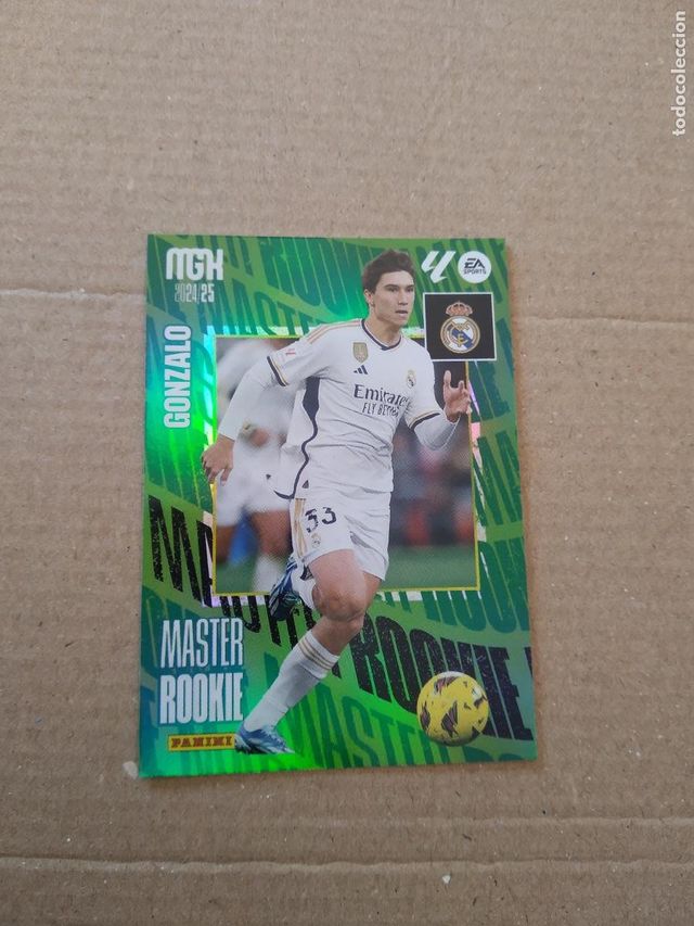 Detalles del productoCromo de Gonzalo, jugador del Real Madrid. Es de la colección Mega Cracks Master Rookie de Panini. - Pertenece a la temporada 2024-25.