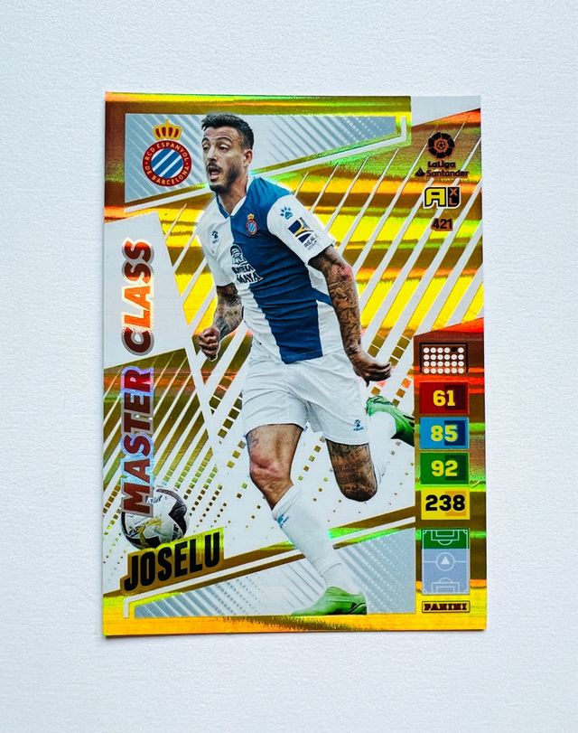 Cromo de Joselu, de la colección Master Class 2022-23. El número de la carta es el 421. La tarjeta está en relativo buen estado.