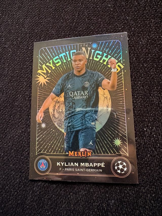 Detalles del productoCarta coleccionable de Kylian Mbappé de la serie Mystic Nights de Topps con el PSG de 2024.