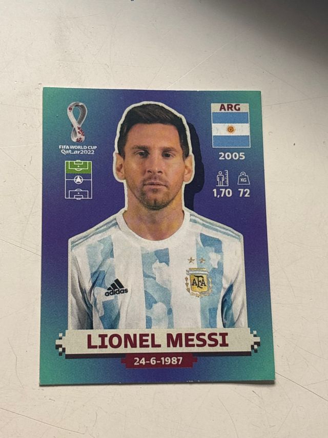 Cromo de Lionel Messi de la colección del Mundial de Qatar 2022. - Jugador: Lionel Messi - Equipo: Argentina - Año: 2005 - Altura: 1,70 m - Peso: 72 kg