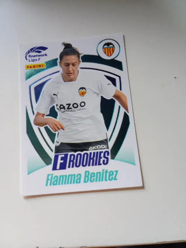Cromo de la Liga F de Panini. - Jugadora: Fiamma Benítez. - Colección: F Rookies. - Incluye logo de Skoda.