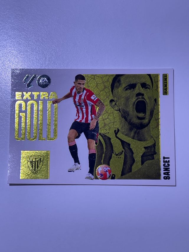 Cromo de Sancet de la colección Extra Gold de Panini. - Diseño con detalles dorados. - Imagen del jugador Sancet. - Incluye escudo del equipo.