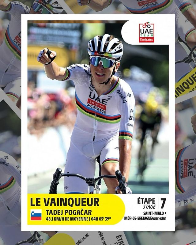 Detalles del productoCromo del ciclista Tadej Pogacar (UAE Team Emirates), como ganador de la etapa 7 del Tour de Francia 2025.